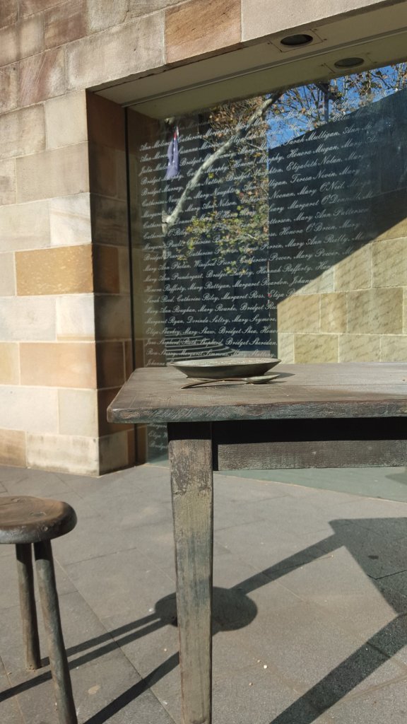 The memorial is simple but evocative. It features a sandstone wall representing the physical dislocation to the girls’s lives. Set into the wall are two glass panels inscribed with the names of 400 of these girls. These names are designed to fade in the sun just as memories fade over time. A table cast in bronze, split in two on each side of the wall, has a simple table with a bowl on one end and a simple institutional table setting with utensils on the other end.