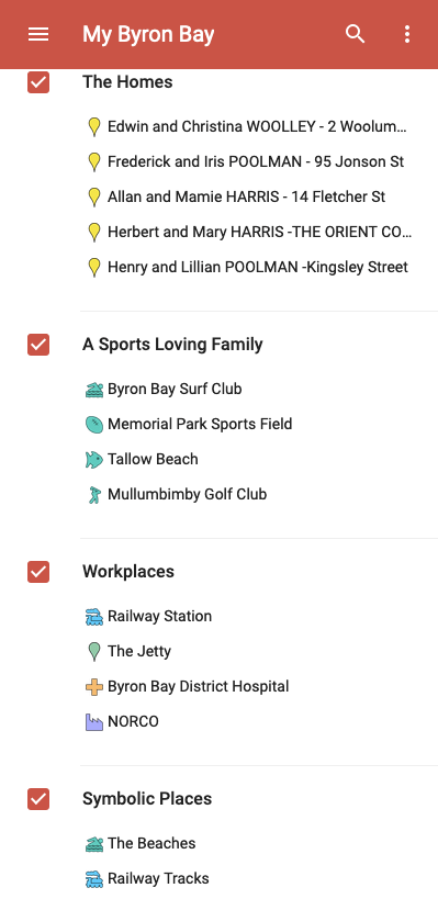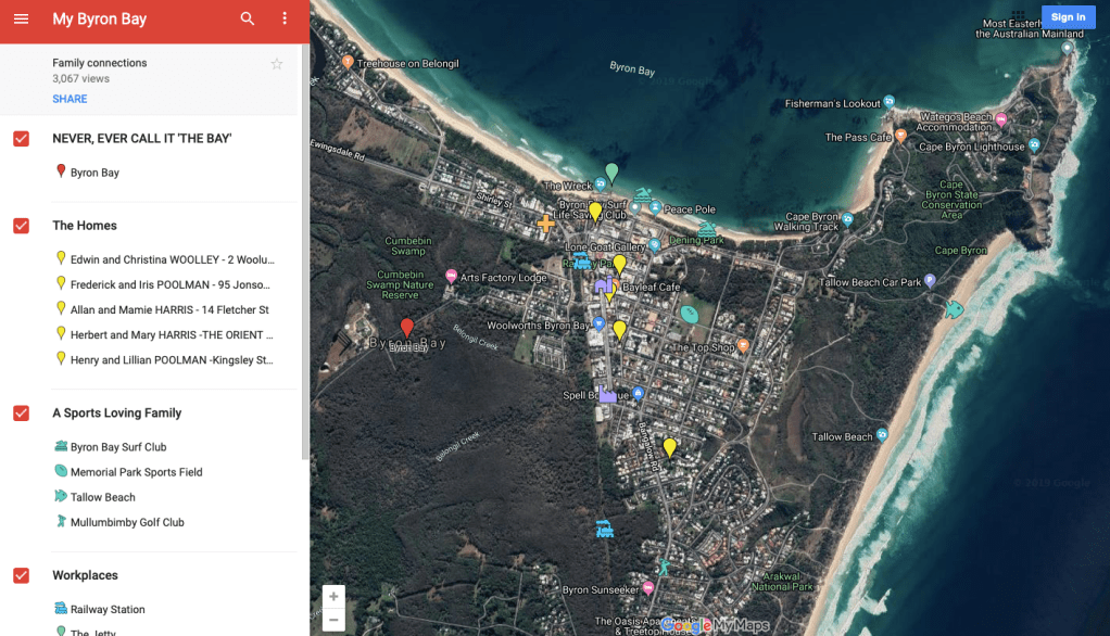 The mapping exercise was a powerful and highly visual way to capture a coherent yet personal history of a lost Byron Bay. It was easy to see that the My Maps program could be applied to any number of the facets of family history.