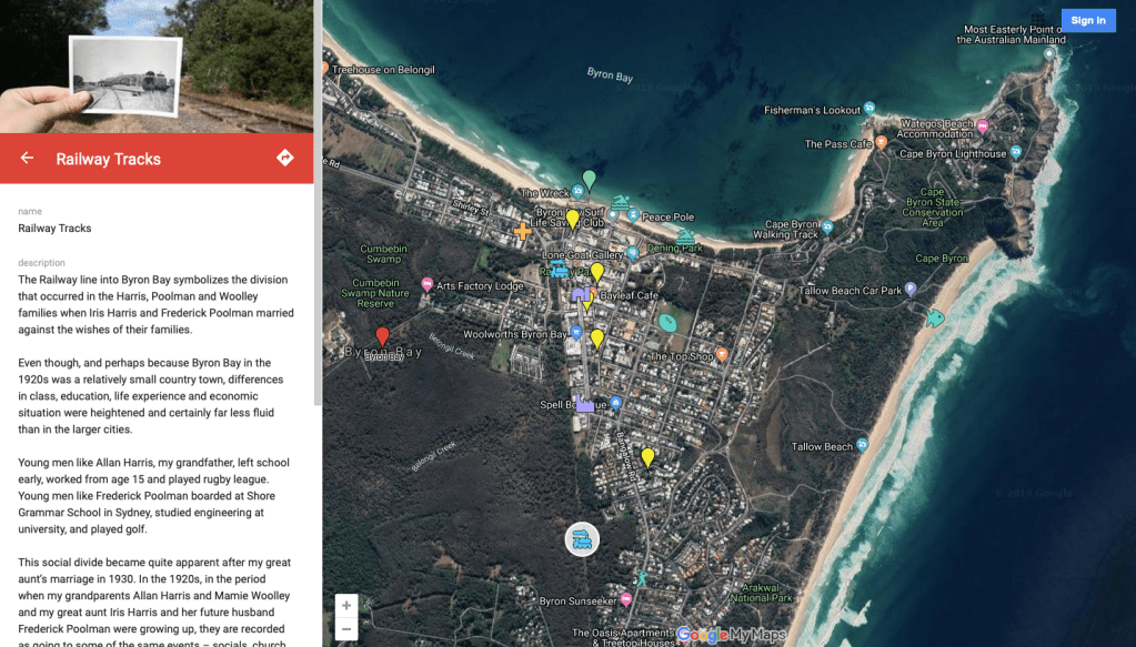 I chose My Maps because I wanted to use a current map of Byron Bay featuring well known attractions – restaurants, cafes, beaches and boutiques (some with international reputations) – and overlay this with locations, along with accompanying images and information, that were important to the Harris, Woolley and Poolman families .