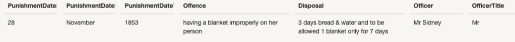 Some incidents were serious and punishment was severe. On 28 November 1853 Margaret was sentenced to ‘3 days bread & water and to be allowed 1 blanket only for 7 days” because she broke the factory’s regulations by “having a blanket improperly on her person“.[7]