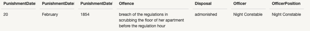 Other incidents were minor but were still recorded. On 25 February 1854 Margaret committed a “breach of the regulations in scrubbing the floor of her apartment before the regulation hour”, something for which she received an admonishment.[8]