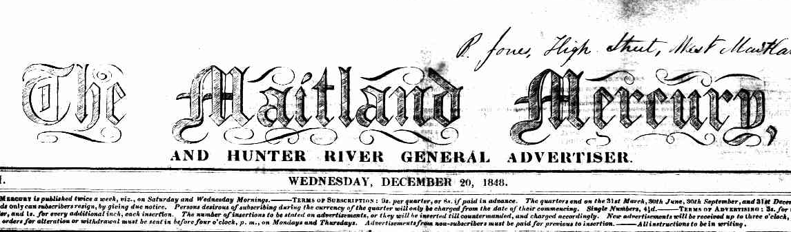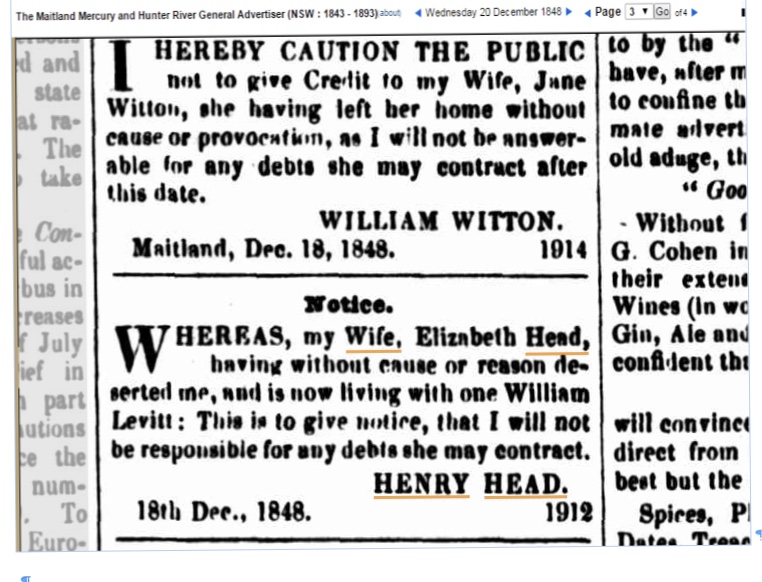 These two notices appeared in the Maitland Mercury on 20 December 1848. They provide very different reading to the Public or Family Notices of today’s newspapers. While I don’t know what happened to the Witton family, I do know what happened in the Head family as Henry (1810-1877) and Elizabeth (1813-1894) are my 4 x great grandparents.