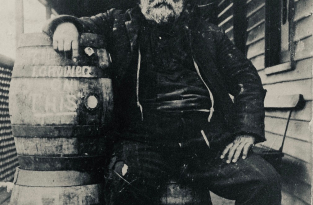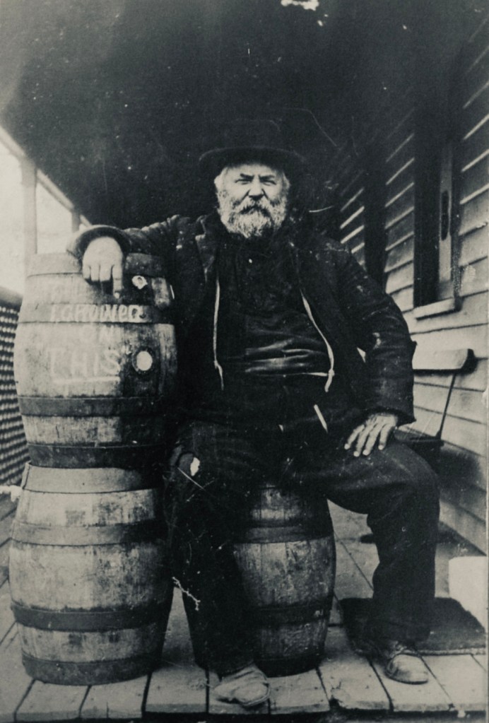 I have no way of knowing with certainty the story behind the photo but using some of the clues I’d like to venture a guess. Richard Standing was large for his era, 20 stone is about 280 pounds and, using other reference points in the photo, I’d say he was over 6 feet tall. With that in mind, he may have been frequently asked: “How did you get to be so big?” So, here he had an opportunity to answer that question, notice his index finger seems to point at his reply. Lastly, looking at the shoe on his right foot it appears to have a rough repair. I would think these are the sort of work shoes you would wear at home and not when going to town, so I vote that Richard is sitting on his own verandah. Perhaps someone, a tavernkeeper, for example, buys Richard’s homebrew and came to the homestead to collect the kegs. Although, why there was a camera handy I cannot fit to my version of the story. Any idea what year this was? Richard appears to be over 50. Fantastic photo, thanks for sharing!