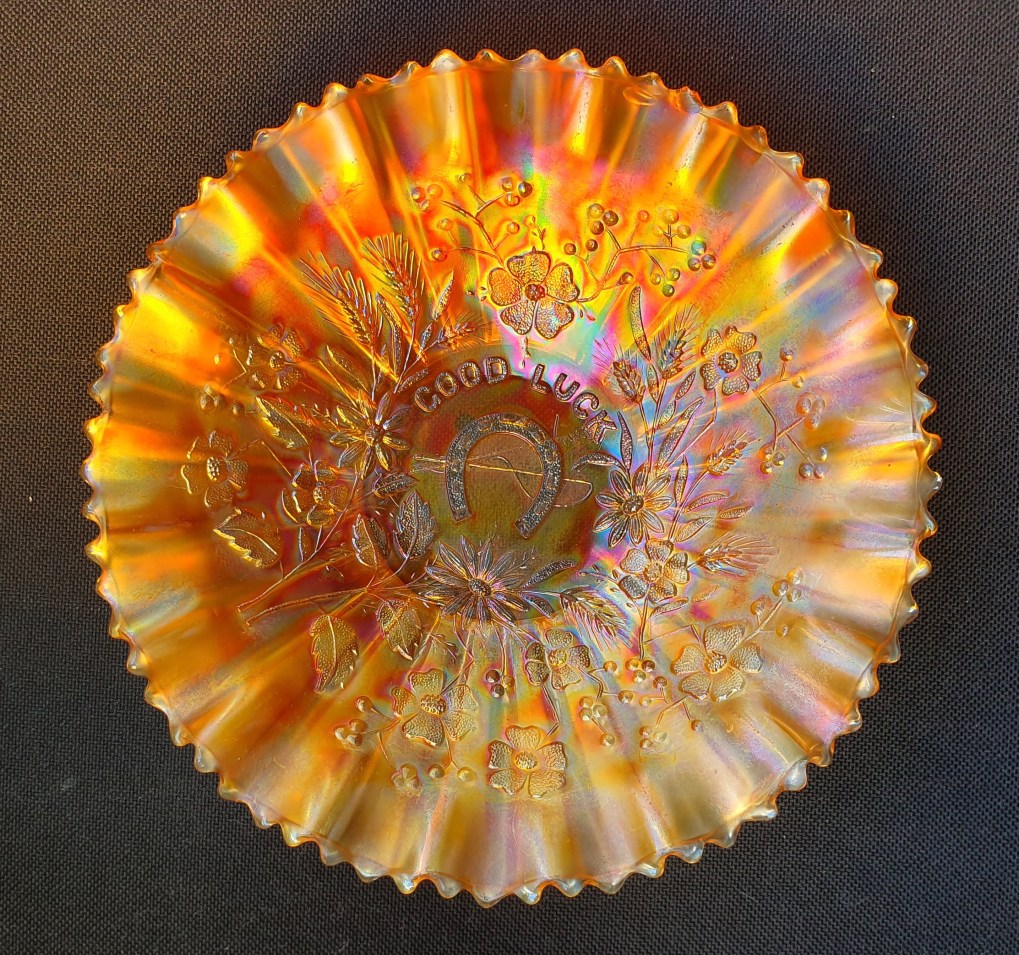 The second thing I ‘rescued’ also holds many memories for me – my Nan’s or paternal grandmother’s, Northwood carnival glass ‘Good Luck’ bowl – or the horseshoe bowl as I called it. I wasn’t really fascinated by the colours of the carnival glass. I was totally fixed on what my grandmother [Mary Thelma Harris nee WOOLLEY] used the bowl for.