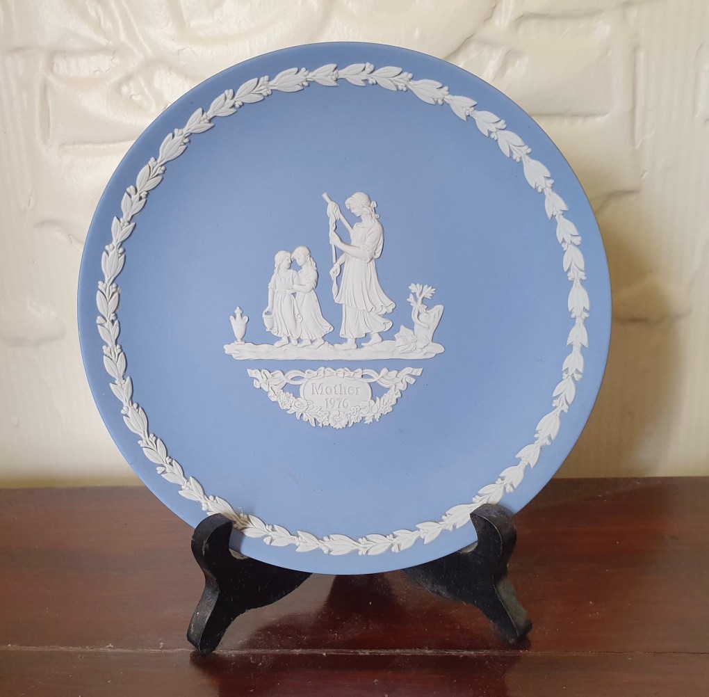 I am one of six children. In 1976 we gave our mother, who loved all things Wedgewood, a Pale Blue Jasper Ware ‘Mother’ plate. Mum liked it so much (or said she did) and a tradition started. Six children and six plates.