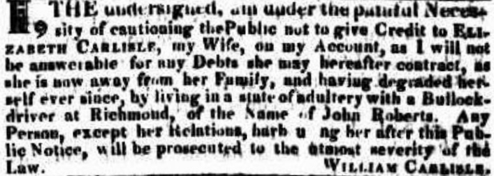 I, the undersigned, am under the painful Necessity of cautioning the Public not to give Credit to ELIZABETH CARLISLE, my Wife, on my Account, as I will not be answerable for any Debts she may hereafter contract, as she is now away from her Family, and having degraded herself ever since, by living in a state of adultery with a Bullock driver at Richmond, of the name of John Roberts, which said Bullock-driver is at this time fully committed to take his Trial at the next Windsor Quarter Sessions for a Robbery at Richmond, Any Person, except her Relations, harbouring her after this Public Notice, will be prosecuted to the utmost severity of the law. WILLIAM CARLISLE